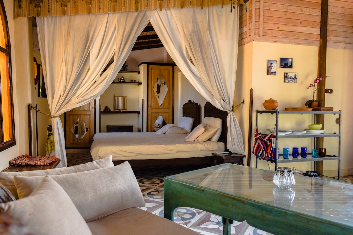 Tässä paikassa voit nauttia upeasta raikkaasta ilmasta ja uskomattomista korkeista näkymistä merelle ja vuorille Dahabissa. Olipa kyseessä työskentely mukavalla työpöydällä tai rentoutuminen tilavalla terassilla, tässä paikassa on kaikki. Se sijaitsee myös kätevästi Asalan keskustassa Dahabissa, vain 10 minuutin kävelymatkan päässä rannalta. Huomaa, että nukkumisjärjestelyt ovat vain 2 yhden hengen vuodetta, ja ulkoterassialueilla on ylimääräisiä sohvia