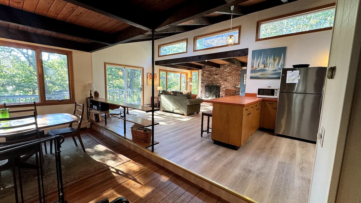 Tervetuloa Baumhausiin, puumajaamme South Truroon. Astu rauhalliseen vuosisadan puolivälin elämykseen. Täysin päivitetty, mutta integroitu kodin Outer Capen moderniin tyyliin. Alkuperäiset sisätilat, korkkilattiat, suuri takka, buffet ja päivitetty keittiö. Ympärillä on puita, ja näkymät lahteen ja P-towniin. Makuuhuone/kylpyhuone/oleskelutila yläkerrassa. 2 makuuhuonetta/kylpyhuone, pesula alapuolella. Bonus huone, josta on näkymät yläpuolelle. <1 mailin päässä Fisherin rannalta ja nopea ajomatka National Seashoreen. Rentoudu, irrota, rentoudu ja nauti.
