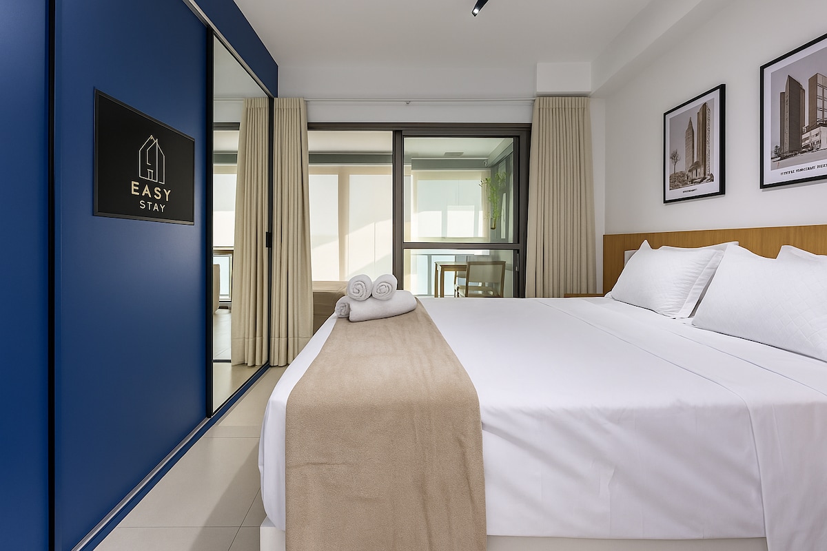 Relaxe neste espaço calmo, cheio de estilo, charmoso e aconchegante. Cama Queen muito confortável, TV Smart50", ar condicionado, cozinha completa. Cadeira balanço suspensa, com uma linda vista de SP. Ideal para uma casal, acomoda 4 pessoas, (2 em sofá cama). Pet friendly! Recepção, self check in, piscina, academia e lavanderia OMO. Mini mercado. Estacionamento no local. Bairro Campo Belo, 5 min. do aeroporto de Congonhas, região com total infraestrutura de restaurantes, comércio e serviços.
