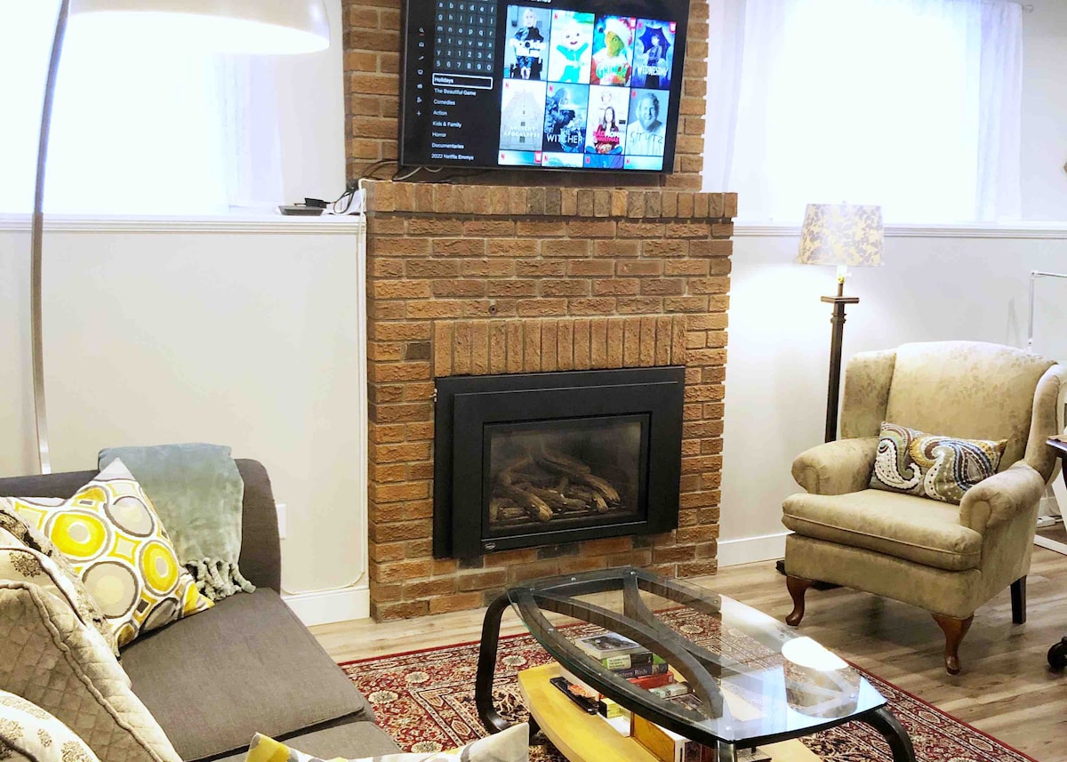 Yksityinen 1 makuuhuoneen sviitti | Täysin varustettu keittiö, pesula, takka