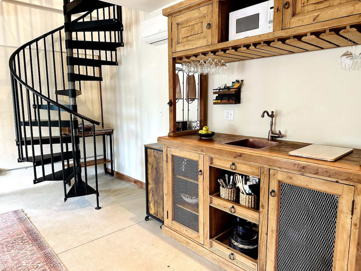 Nauti 140 neliömetrin maalaismaisen viehättävästä tilasta! Tämä kaksikerroksinen asunto sijaitsee kiinteistömme alkuperäisessä navetassa, ja siinä on täysin varusteltu keittiö, täysin varusteltu kylpyhuone ja kaksi yksityistä makuuhuonetta. Toisessa makuuhuoneessa on queen-vuode ja mukava lukutuoli, toisessa queen-vuode ja kerrossängyt. Lasten loftissa ja pelihuoneessa on kaksi yhden hengen vuodetta ja tilava yhteinen alue, jossa on korkeat 20 jalan korkuiset katot – täydellinen rentoutumiseen pitkän tutustumispäivän jälkeen. Koirat ovat tervetulleita, mutta kissat eivät ole allergioiden takia