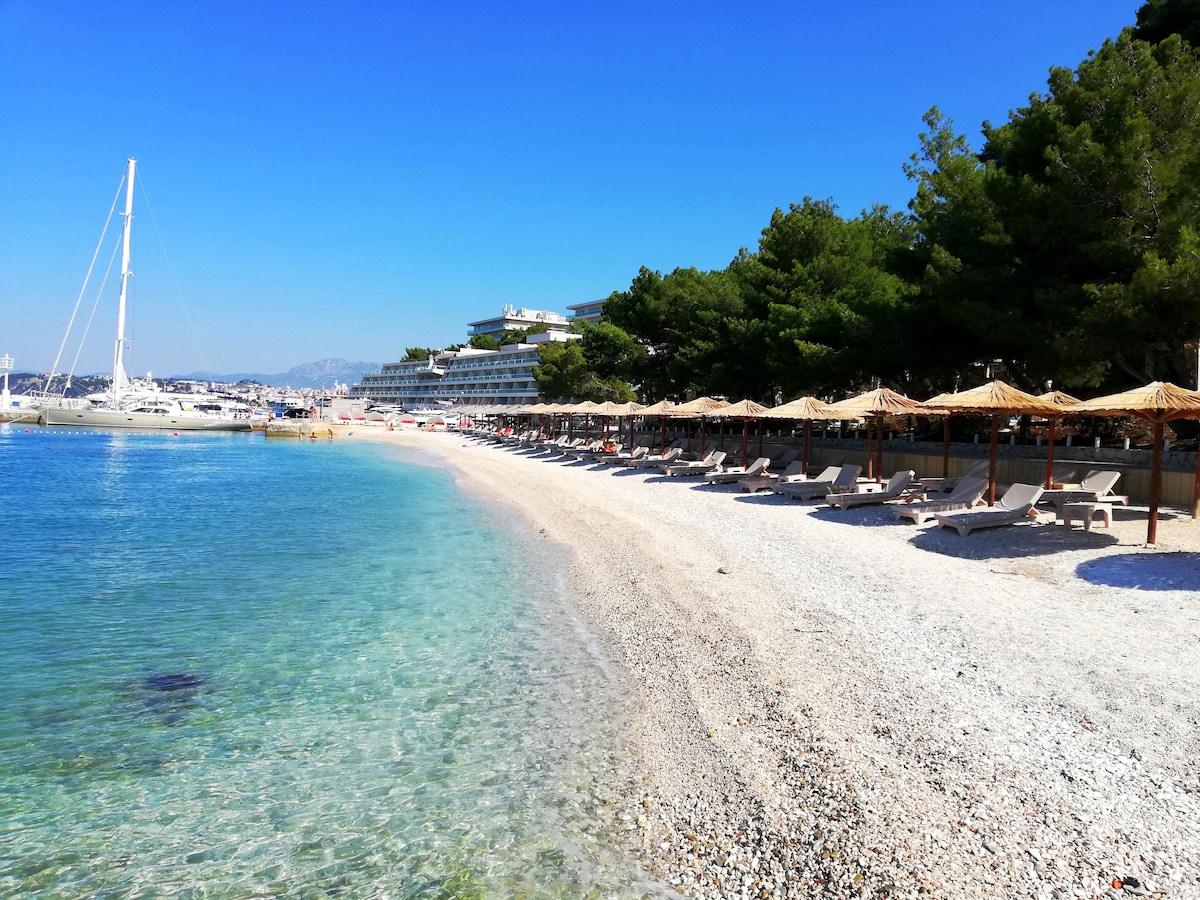 Suuressa huoneistossamme on kaksi makuuhuonetta, joissa on king-size-vuode ja kaksi yhden hengen vuodetta, valtava vaatekaappi ja säilytystila, suuri parveke, josta on kaunis näkymä merelle, keittiö, kylpyhuone, TV, WiFi. Talon edessä on ilmainen pysäköinti. Ranta on kahden minuutin ajomatkan päässä talolta. Split on 10 minuutin ajomatkan päässä talosta. Siellä on paljon ravintoloita, urheilua ja kaikenlaisia aktiviteetteja, joita voit kuvitella! Talon ympärillä oleva luonto on uskomatonta ja ainutlaatuista.