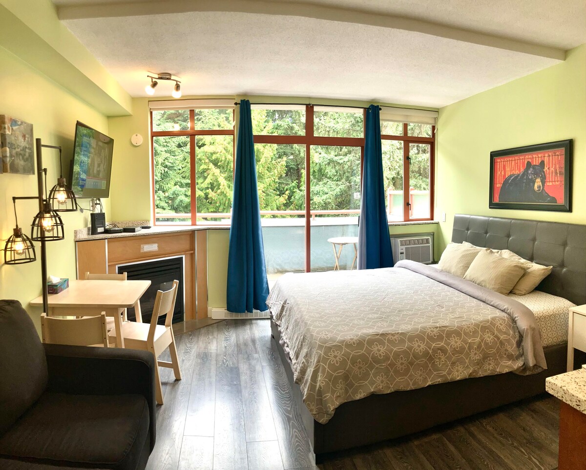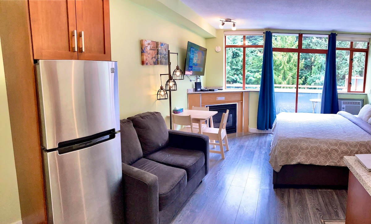 HOT TUB AND POOL CLOSED FOR RENOVATIONS FROM APRIL7- AUG/SEPT 2026. PRICES DISCOUNTED ACCORDINGLY. Nestled right in the heart of Whistler Village and only a short walk to bars/restaurants and shops. Small deck with great mountain views. Guests have access to hot tub and sauna and secured paid parking. Amenities are subject to closure for maintenance. Studio has fully equipped kitchenette, free access to internet and firestick. 7 minute walk to the base of both Whistler and Blackcomb mountains