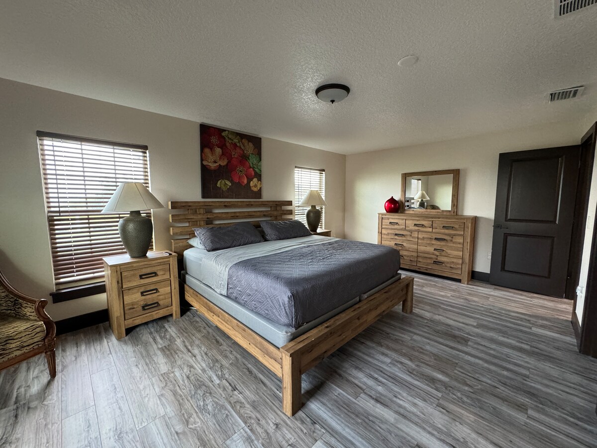 Private Master Suite with it's own exclusive entry. It has a convenient kitchenette complete with mini refrigerator, microwave, toaster, toaster oven and an outside grill. Comfy Queen size bed with overhead ceiling fan. Private Bathroom and shower. Lake view from the front of property, unit is in the back overlooking wetlands. Plenty of parking, with enough room to bring a boat.