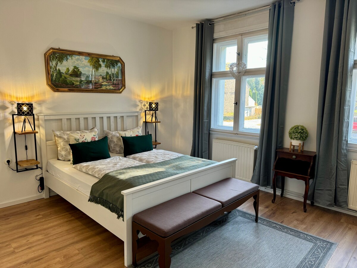 Ullakkoasunto 20 minuutin ajomatkan päässä Potsdamista ja Berliinistä ja 30 minuutin junamatkan päässä BER:stä. Tilava, täysin varusteltu design-keittiö*, kylpyhuone, jossa on Agape Vieques -kylpyamme ja yhteensopiva pesuallas*, makuuhuone, jossa on 2,70 m leveä sänky*, kuntoiluhuone, jota voidaan käyttää toisena makuutilana. Täällä on 1,80 m parivuode * projektori, jossa on esiasennettu sovellus NETFLIX, Disney + ja Amazon Prime Login, leluja, supermarket, jossa on leipomo ja lihakauppa, juomakauppa * uimajärvet ja patikointi
