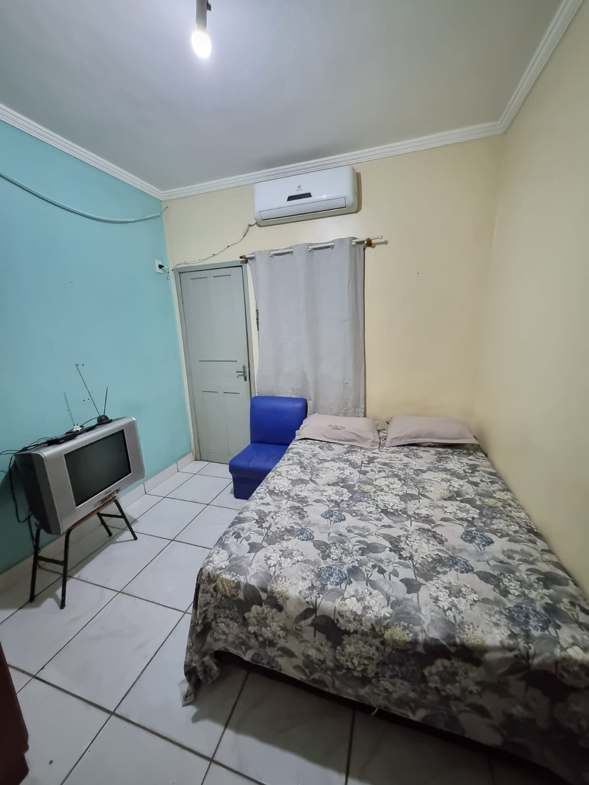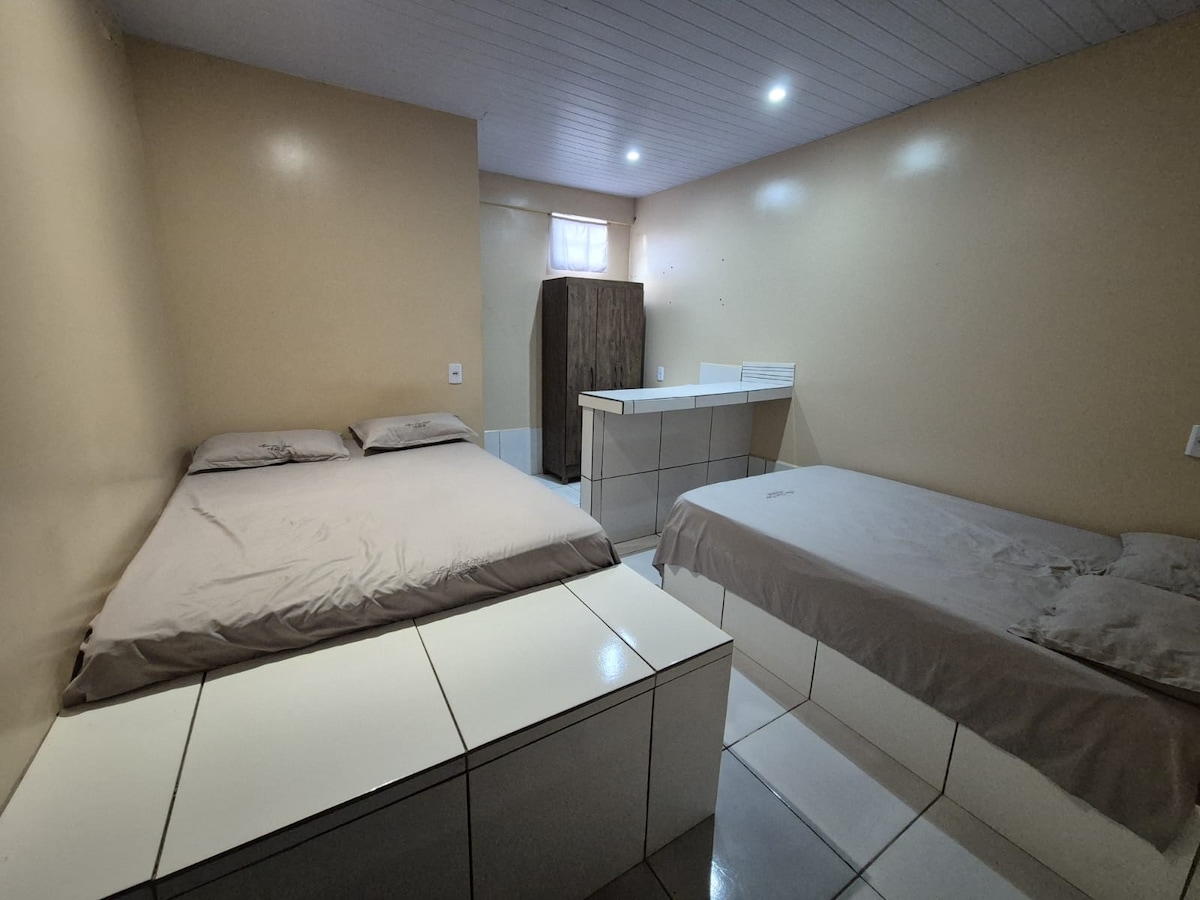 Suíte familiar com uma cama de casal e uma cama de solteiro, acompanha uma, TV, ar-condicionado de janela, guarda-roupas, uma cadeira e banheiro privativo.Em área central de Porto Velho-RO há 5 minutos da rodoviária, e há 4 minutos do Supermercado Irmãos Gonçalves. E próximo também de farmácia, restaurantes e lanchonete. Aproveite o fácil acesso a tudo isso ficando neste espaço charmoso.