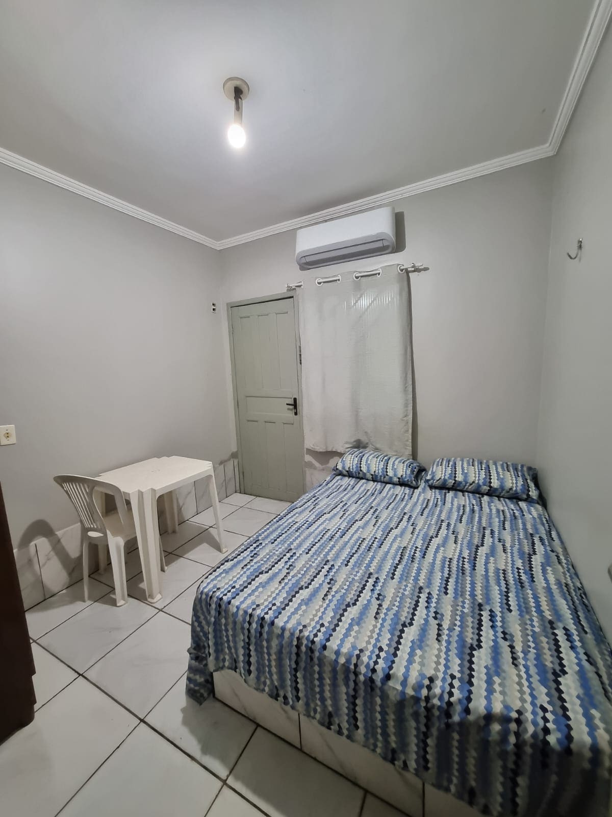 Suíte econômica com cama de casal, ar-condicionado de janela, TV, mesa com uma cadeira e banheiro privativo. Em uma boa localização. Em área central de Porto Velho-RO e próximo à rodoviária, mercado, farmácia, restaurantes e lanchonete. Aproveite o fácil acesso a tudo isso ficando neste espaço charmoso.