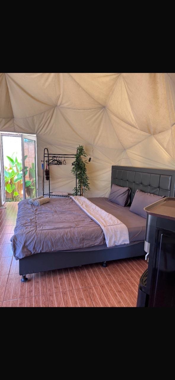 Tutustu tätä majapaikkaa ympäröiviin lumoaviin maisemiin. Glamping yoval on glamping sijaitsee Mahkota Sangkurianc Eco-Tourism Village Area Cisarua Lembang viileä ja kaunis ilma ja lähellä luontoa. *Mukavuudet: * - Geodeettinen kupoliteltta - 1 queen-size-vuode - Kylpyhuone kylpyhuoneessa - Yksityinen poreallas - nuotiopaikka - huvimaja - Älytelevisio - WiFi – grillausvälineet ja ruokailuvälineet - vedenlämmitin - Pori - ympärivuorokautinen turvallisuus - Yhden portin järjestelmä – aamiainen 2 hengelle