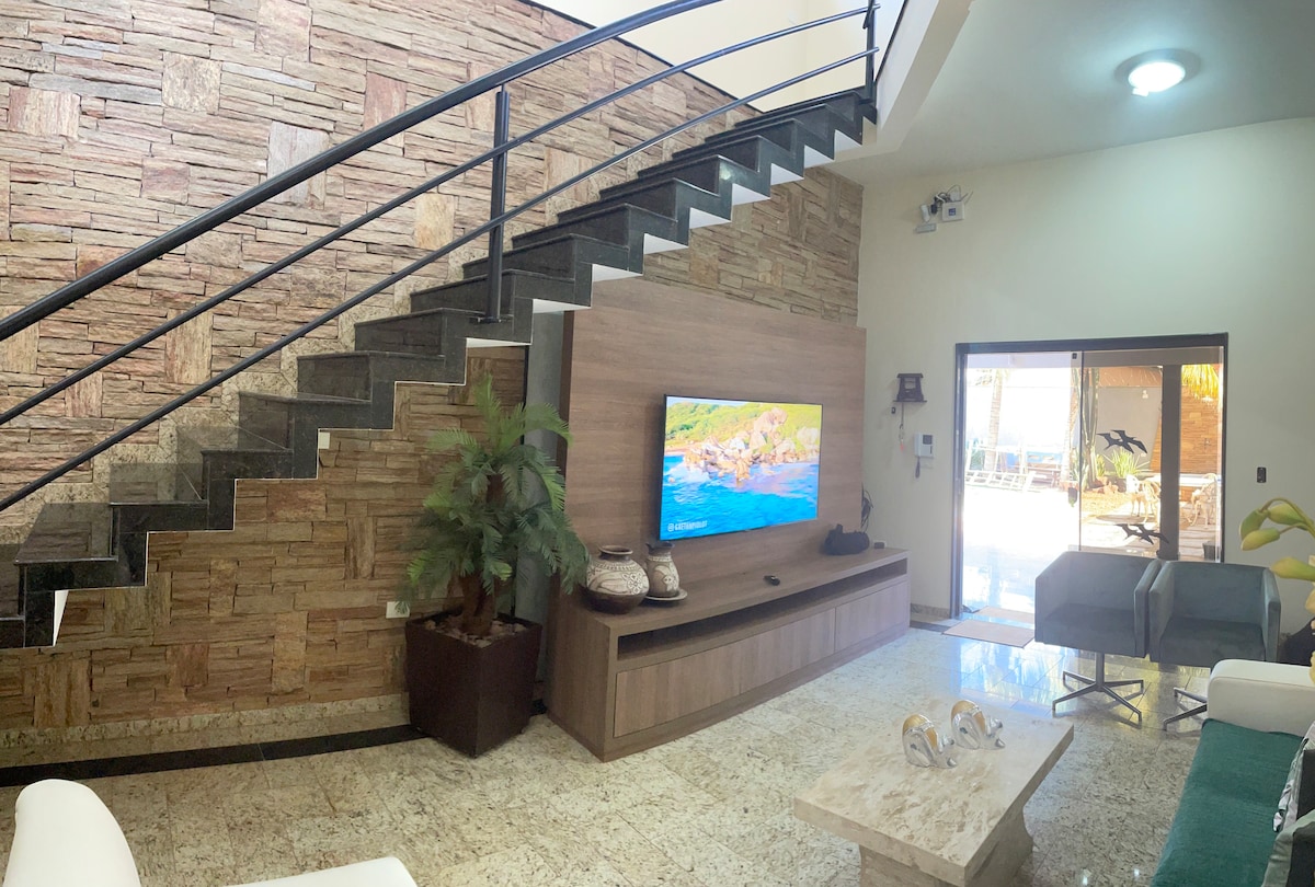 ILMASTOITU SISÄTILA. Autolla talo on alle 1 minuutin päässä MacDonald 'sista ja City Mall -ostoskeskuksesta. Voit kävellä Avenida Guanabaralla sijaitsevaan apteekkiin, supermarkettiin, ravintoloihin ja jäätelökauppoihin. Korostan, että 3 makuuhuoneessa on tv-huoneen ja keittiön lisäksi ilmastointi. Talossa on pysäköintipaikka 2 autolle. Saapuminen Aqualinda Parkiin 3 minuutissa. Täydellinen kausi sinulle ja perheellesi, yhteensä 7 henkilölle.