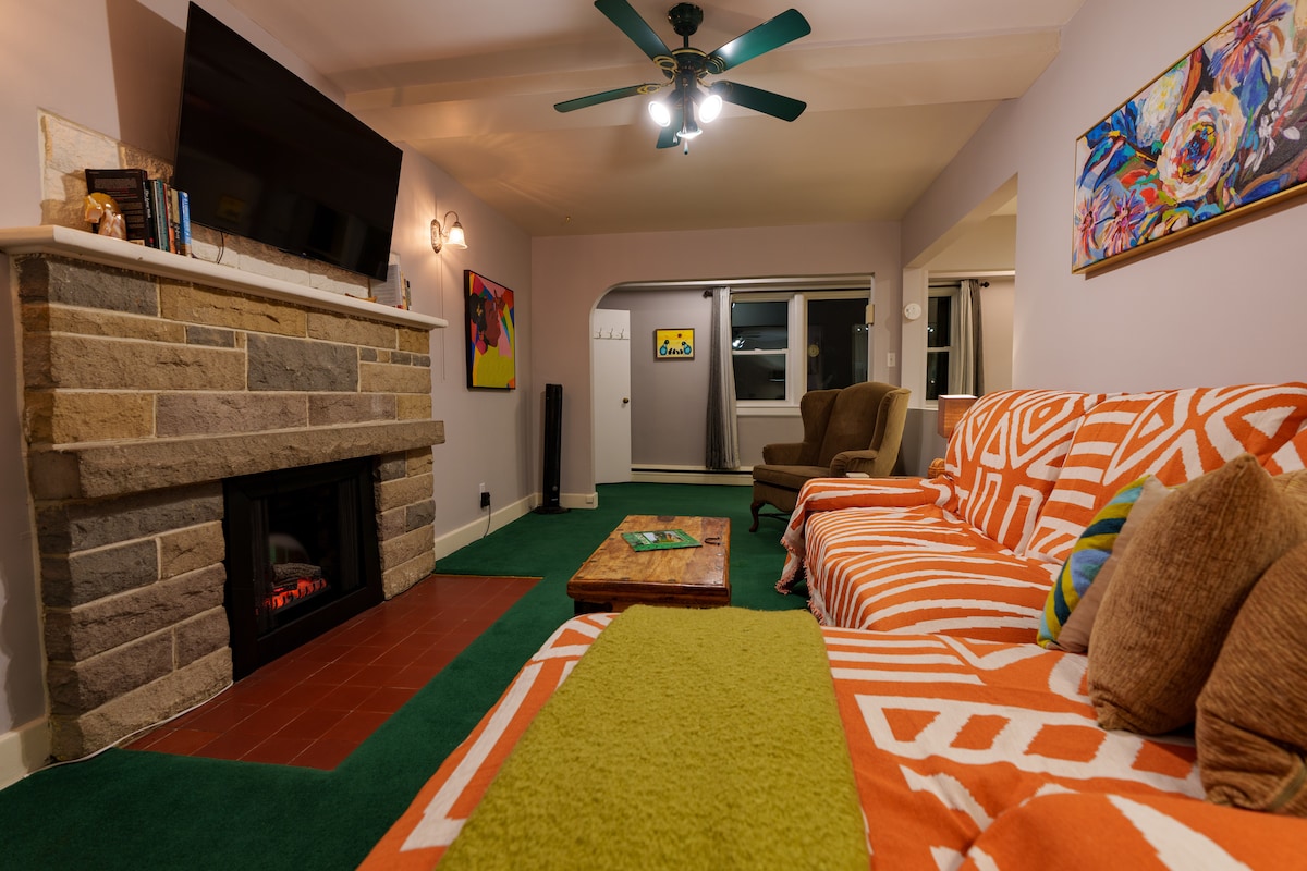 Tervetuloa keskeisellä paikalla sijaitsevaan yksityiseen asuntoomme. Suuret ikkunat, jotka valaisevat täysin varusteltua keittiötä, viihdetila, jossa on 55 tuuman äly-tv, lautapelejä, levysoitin, mukava makuuhuone, jossa on queen-vuode ja ilmastointilaite, sekä suuri kylpyhuone. Nauti yksityisestä ulkoalueesta henkilökohtaisen pysäköintipaikkasi vieressä. Keittiössä on: - Leivänpaahdin - Keurig-kahvinkeitin + uudelleenkäytettävät kupit - Liesi - vedenkeitin - Kattilat ja pannut - Ruokailuvälineet ja muut keittiötarvikkeet - Mikroaaltouuni - Minijääkaappi pakastinosalla