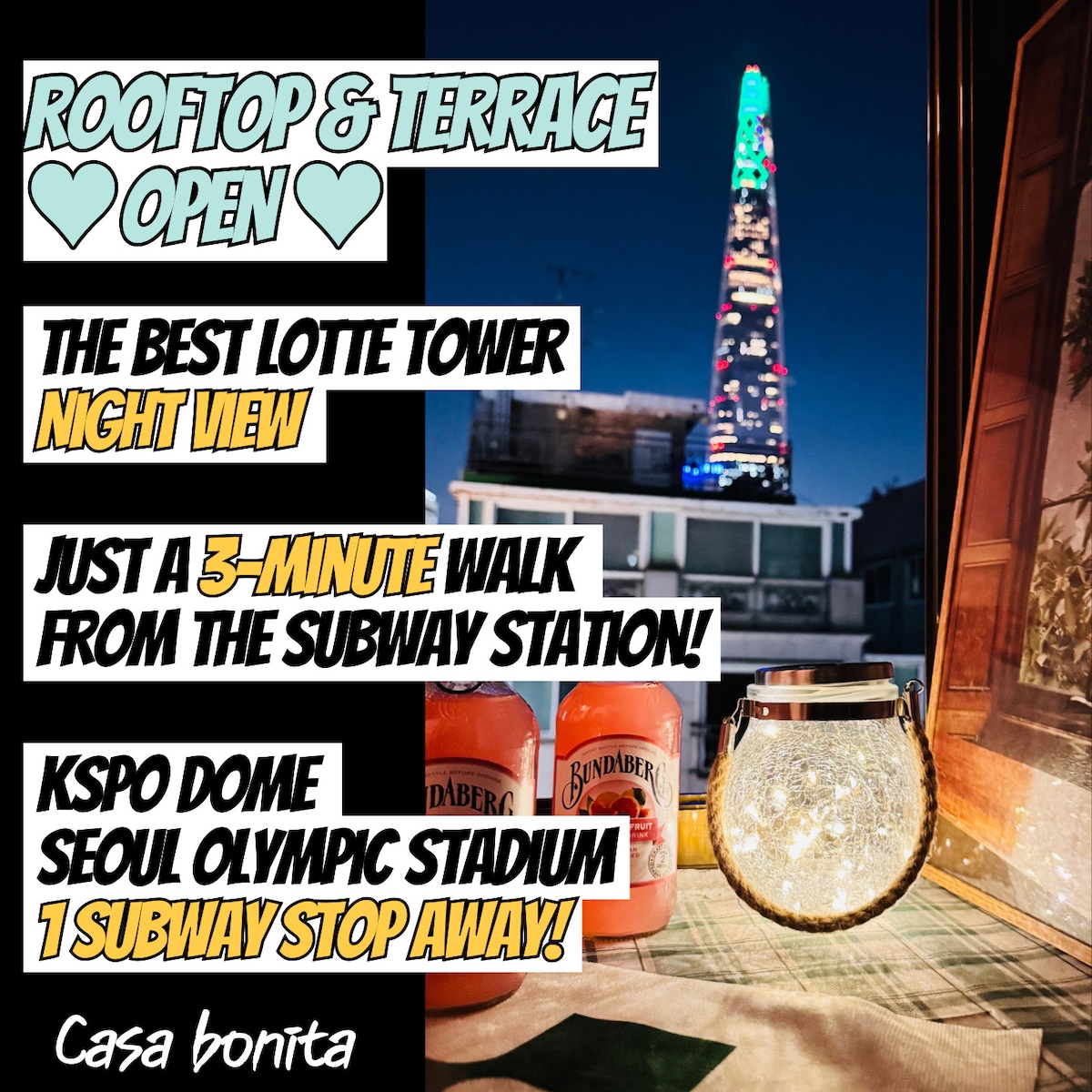 # Lotte Tower 10 minuuttia # Seokchon Lake 5 minuuttia # KSPO # 9 hengen suuri majoitus # 3 huonetta 5 vuodetta # Ilmainen matkatavarasäilytys