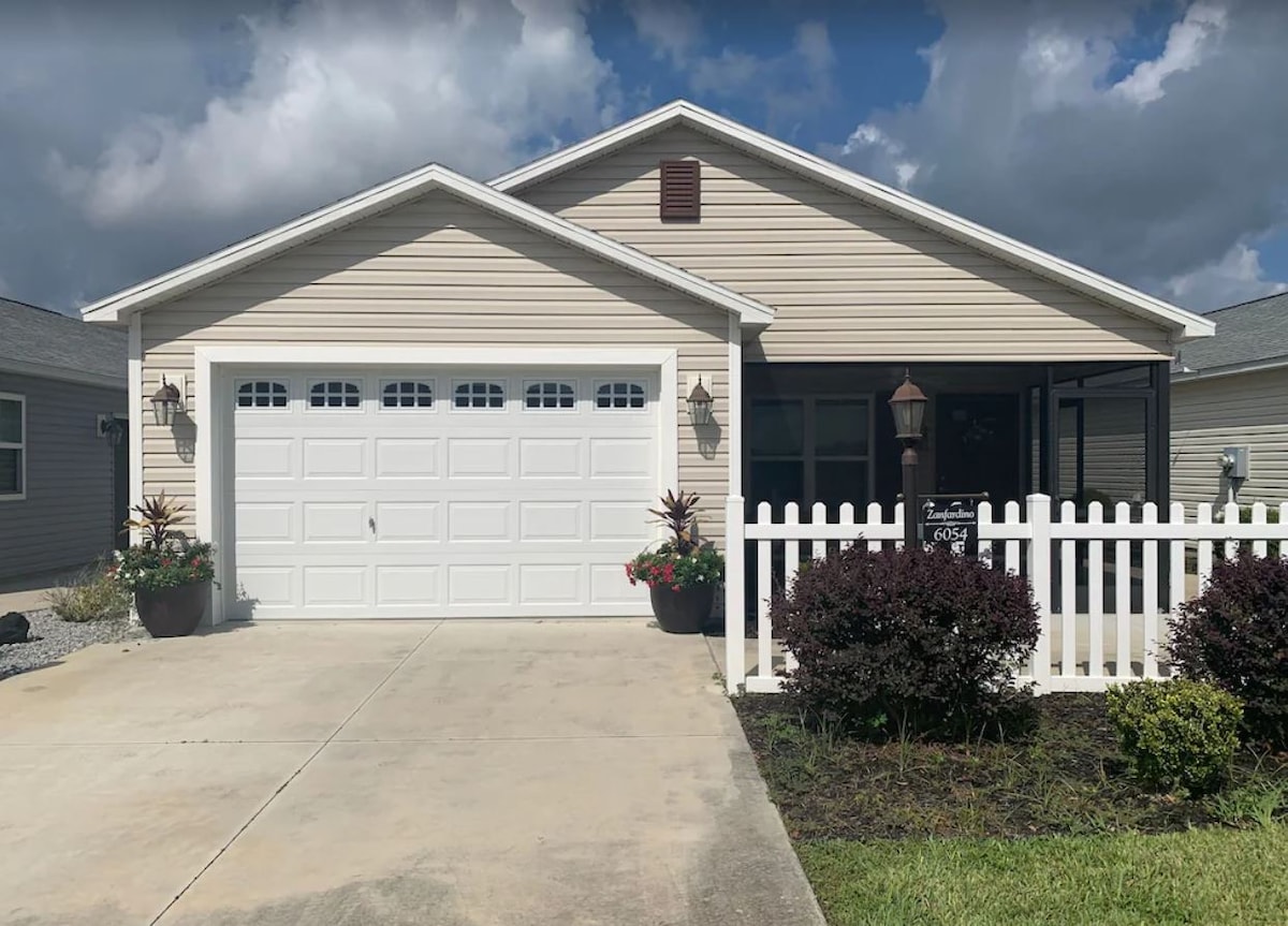 HYVÄ SIJAINTI! Kaunis 2 makuuhuoneen ja 2 kylpyhuoneen kohde, jossa on suolavesisallas ja poreallas. 77 tuuman TV äänijärjestelmällä ja 2 auton autotalli/golfauto. Outdoor bar with big screen TV with sitting area and a second sitting area outside the bird cage. Molemmissa makuuhuoneissa on televisio. Mahtavaa asumista ulkona! Minuuttia kaikkeen golfautolla: Brownwood 12 Sumter 16 Sawgrass 19. 4 champ golf and 7 exec golf courses 5-10. Publix, Walmart 5 minuuttia Golfauto 2022 Yamaha sisältyy hintaan! Tupakointi kielletty!