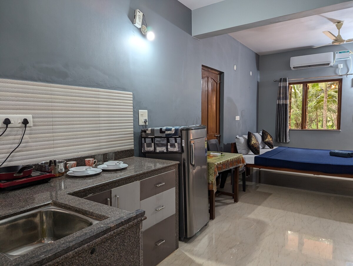 Cloistered in the most prime coastal area of South Goa,our well designed 1 BHK studio is located at walk distance from Goa's famous Colva beach,yet macked in a peaceful location. Our beach side apt complex is power filled with amenities such as Hi speed internet,pool,power backup,parking, gated complex with 24 hrs security,Clubhouse, gym making it a ideal vacation home. The grocery stores,shacks and cafes are a walk away. The apt has also a fully functional kitchen & AC in both rooms