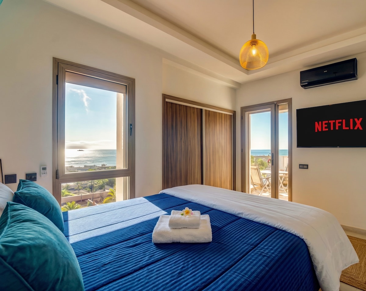 Ylellinen kattohuoneisto, josta on panoraamanäkymät Atlantin valtamerelle Taghazoutin sydämessä. Ainutlaatuinen ja hienostunut talo, jossa on huomiota yksityiskohtiin, hienoista materiaaleista design-huonekaluihin. Talossa on 4 makuuhuonetta, joista kahdessa on parivuode, yhdessä oma kylpyhuone, makuuhuone, jossa on kaksi yhden hengen vuodetta, ja tilava yhden hengen huone. Suuri olohuone, jossa on ikkunat merinäköalalla, varustettu keittiö, josta on näkymä merelle, ja terassi, jossa on sohvat, ruokapöytä ja grilli. Hotellipalvelu pyynnöstä.