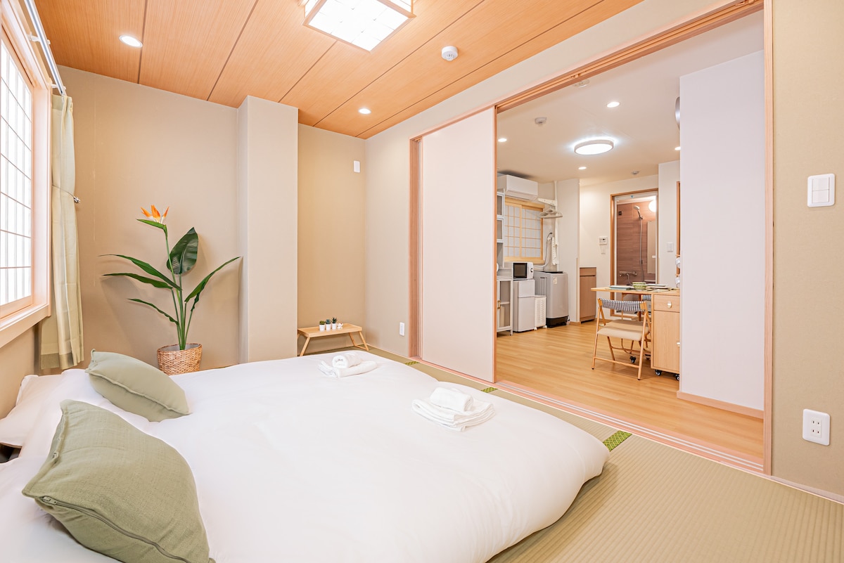 Uusi Japandi-studio, JR-asema/metroasema kävelymatkan päässä, pyykinpesukone kuivausrummulla, hissi, matkatavaroiden säilytys