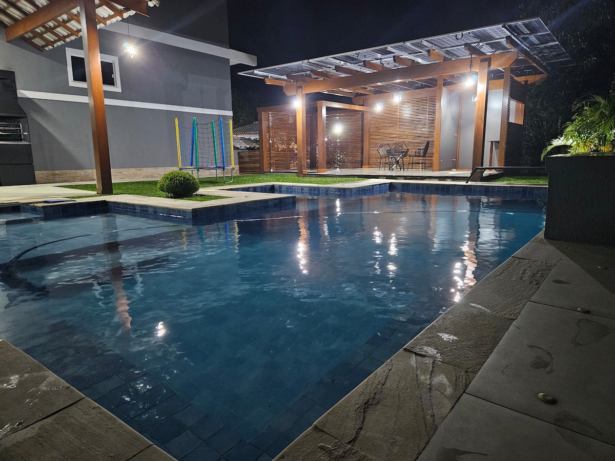 Casa contemporânea novíssima em condomínio fechado em Albuquerque (Região do Green Valley, no Km 4 da Terê-Fri). Os 3 quartos possuem ar condicionado e TV smart. Local tranquilo, seguro, bastante ensolarado e junto à natureza, porém a poucos minutos de carro do Centro (apenas 10km). Piscina privativa com possibilidade de aquecimento (cobrado à parte). O aquecimento deve ser solicitado até 72 horas antes do início da estadia e tem o custo de R$ 200 do pré-aquecimento mais R$ 100 por diária.