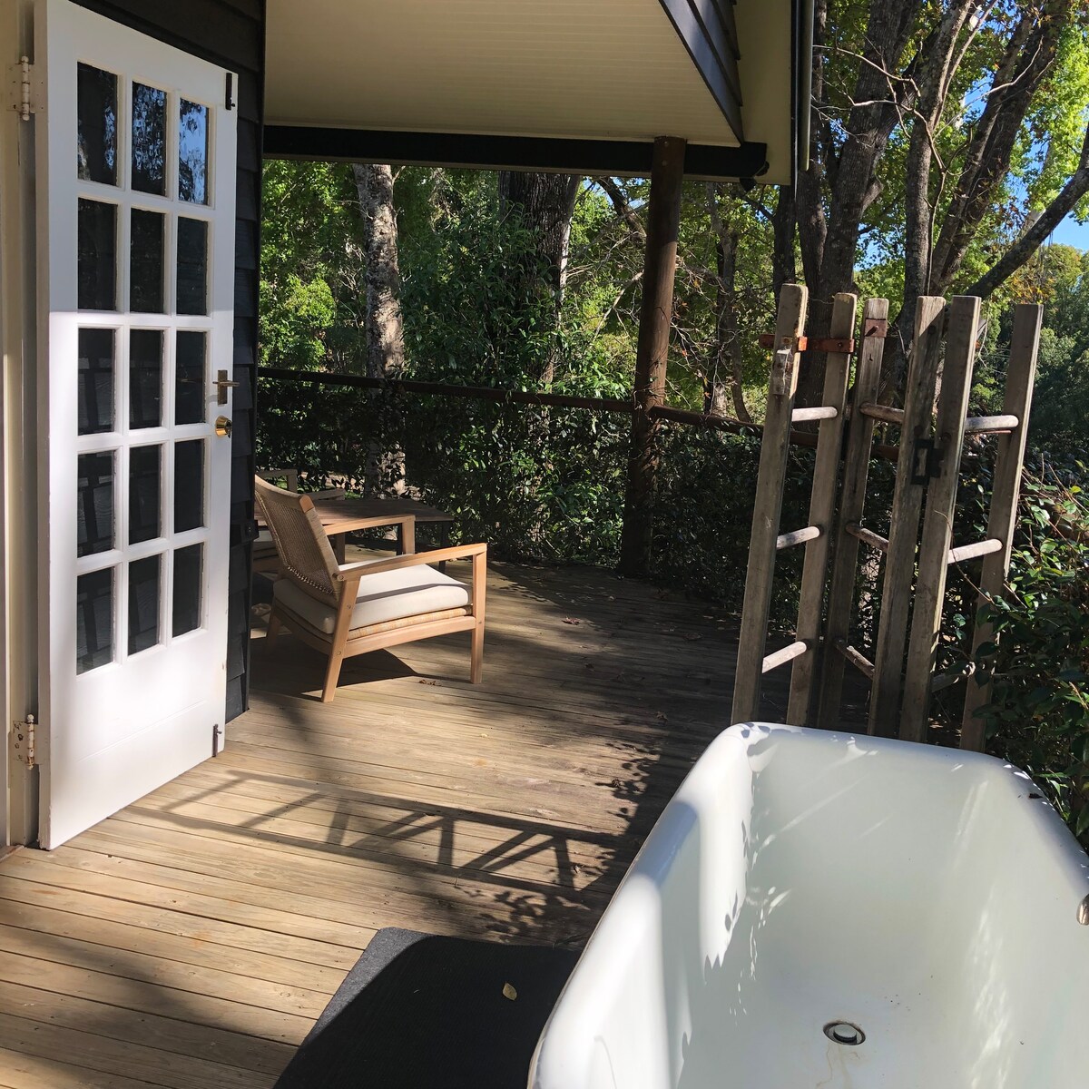 Tranquil garden cottage. Short drive from the historic village of Newrybar, 15min from Bangalow and Lennox Head's beaches and just 25min to Byron Bay. We are Pet friendly! Open plan living, modern kitchen and a unique bathroom, all with large windows that bring the outdoors in. A covered deck deck bathes in sunshine + looks across the garden you share with rescue hens who lay fresh eggs for breakfast! Doors open directly from the bedroom to a 2nd deck shaded by the canopy of a Poinciana tree