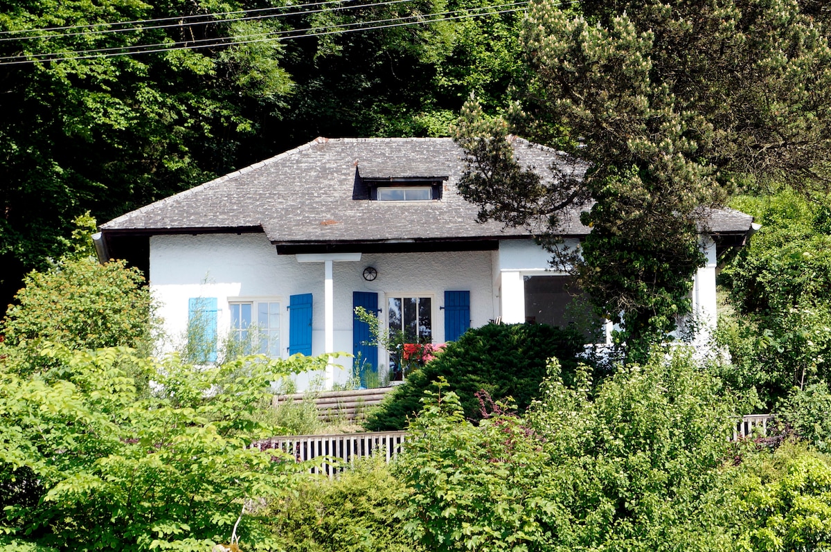 Romanttinen mökki, josta on näkymä Attersee-järvelle