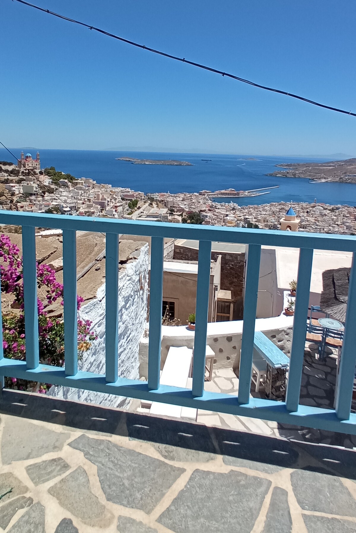 Merenrantaan sijaitseva, erittäin kaunis huoneisto, suuri kahden huoneen huoneisto toisessa ja viimeisessä kerroksessa, yksinään kuin talo. Huoneiston jatkeena on kaunis 38 neliömetrin terassi, jolta on näkymä uuteen satamaan, merelle ja lähisaarille (Dilos, Syros, Mykonos, Naxos, Paros). Kaikista päähuoneista voit ihailla merta. Paljon viehätystä, laadukkaita materiaaleja, hienostunutta ja taiteellista sisustusta. Erittäin hyvällä paikalla kaupungin keskustassa: liikenne, kaupat, ravintolat, rannat lähellä