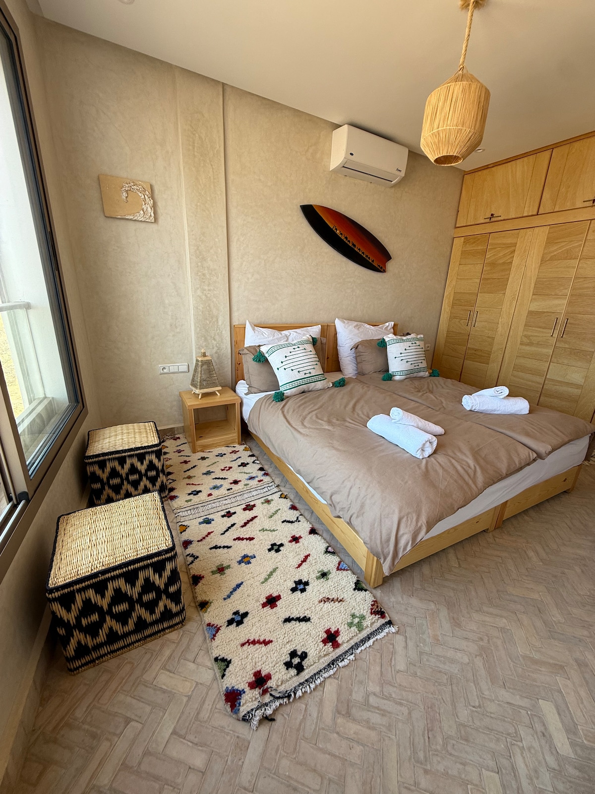 C'est le seul appartement dont le balcon de 17m2 est construit au dessus du chemin qui longe la plage, offrant une vue exceptionnelle sur les vagues, le village, les pêcheurs, les surfeurs. Très confortable, décoré et entretenu avec soin pour un séjour exceptionnel au dessus de l'océan, proche des nombreux cafés et restaurants longeant la plage et à 2 pas des écoles de surf, au coeur de ce village berbère convivial mêlant pêcheurs, commerçants, surfeurs du monde entier...et quelques touristes.