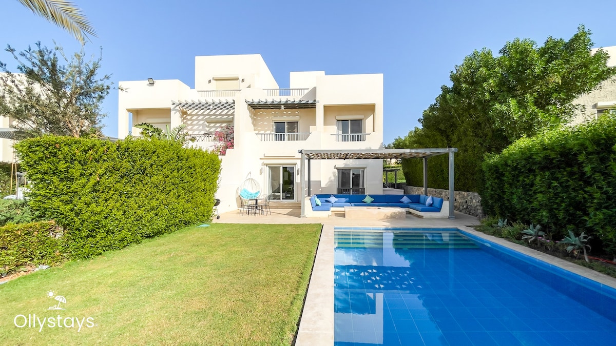 Magical, modern white Villa! You will have total privacy around the garden and your private heated pool. Villa is fully equipped with anything you can imagine and has a wonderful view towards the open Red Sea, the mountains and El Gouna. Barbecues are outside and huge chill out area upstairs on the roof top. Orascom pool people are coming every day and are helpful with any questions you have. Cleaners are also available every day upon request.