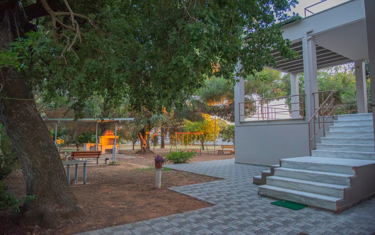 Huvila sijaitsee korkealla Ioanninan kaupungin kukkulalla, ja sieltä on upeat näkymät! Keskus on 2 minuutin ajomatkan päässä, tai voit kävellä alamäkeen (25 minuuttia) ja palata taksilla (+-5 euroa). Muutaman askeleen päässä talosta on mäntymetsä, jossa voit kävellä tai lenkkeillä. Talossa on yksityinen uima-allas (touko-syyskuu) ja ulkogrilli, jossa voit rentoutua ja nauttia päivästäsi! Talon ulkopuolella on suuri pysäköintialue! Taloon mahtuu 7 henkilöä!