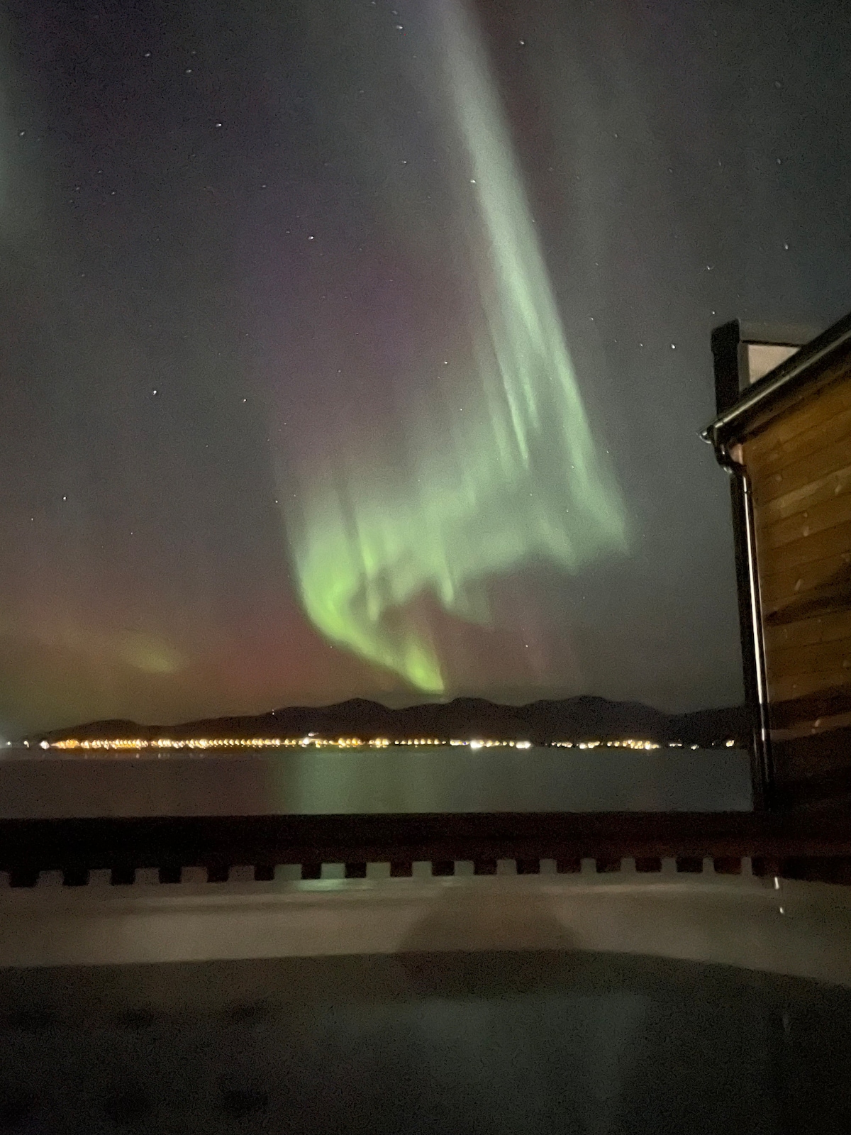 Moderni kohde, josta on näkymä – vuono, vuoret ja revontulet