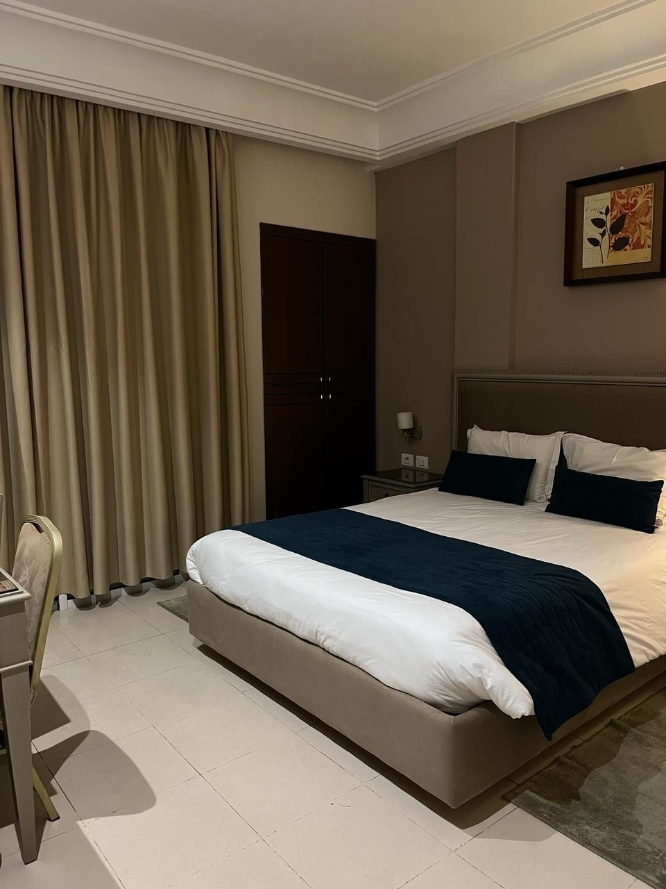 Korkealla seisova huone, jossa on parveke, josta on näkymä Välimerelle. Itämaisessa sisustuksessa on enemmän kuin mukava yksittäinen kylpyhuone ja wc, hiustenkuivain, parveke, satelliitti-tv, puhelin, ilmastointi, magneettikortit ja minibaari.