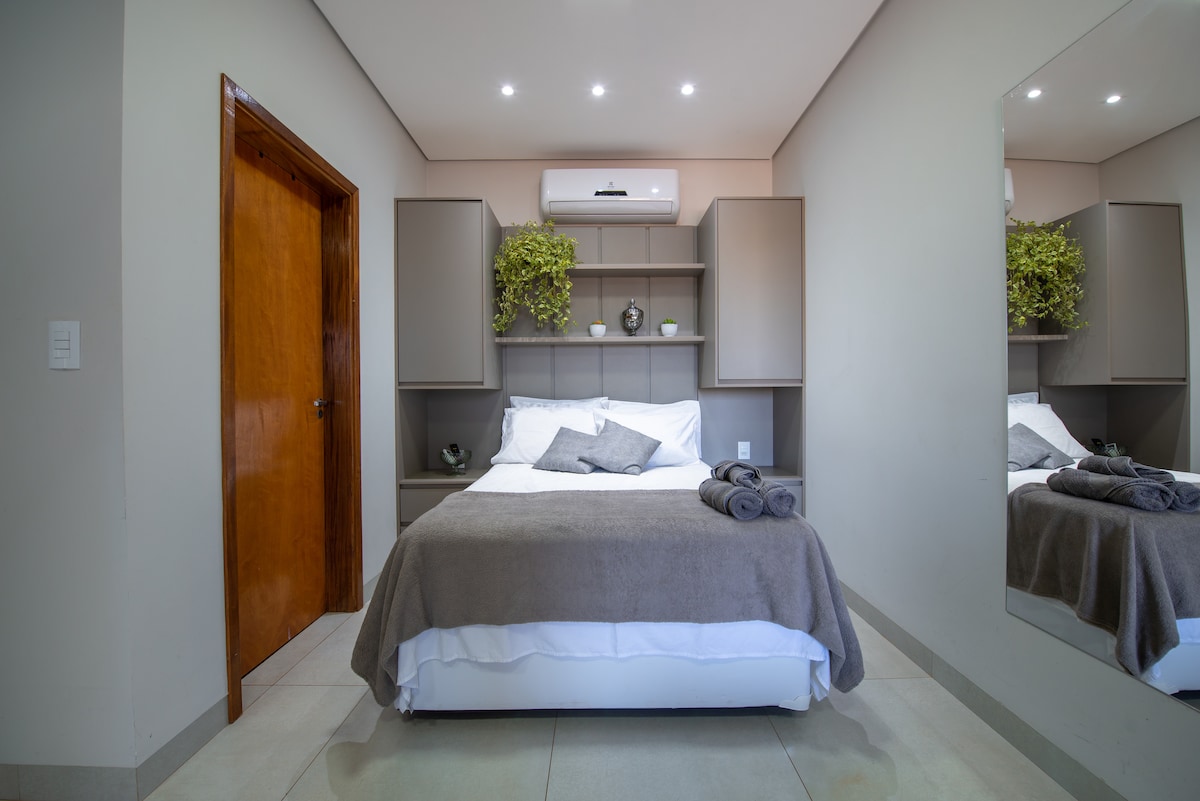 Tämä huoneisto on suunniteltu tuomaan mukavuutta, hyvinvointia ja mielenrauhaa! Siinä on queen-vuode, kattotuuletin ja kannettava tietokone, ilmankostutin, vuodevaatteet ja pyyhkeet. Täysin varustettu keittiö, keittiövälineet, liesitaso, riisinkeitin, sähkögrilli, jääkaappi, mikroaaltouuni, vedensuodatin, sähköuuni, liesituuletin, silitysrauta ja -työtaso, tv ja wifi. Autolla 7 minuuttia Unitri- ja Uberlândia-ostoskeskuksista, 10 minuuttia Pitágoras-kollegiosta, 2 minuuttia supermarketista ja apteekista.