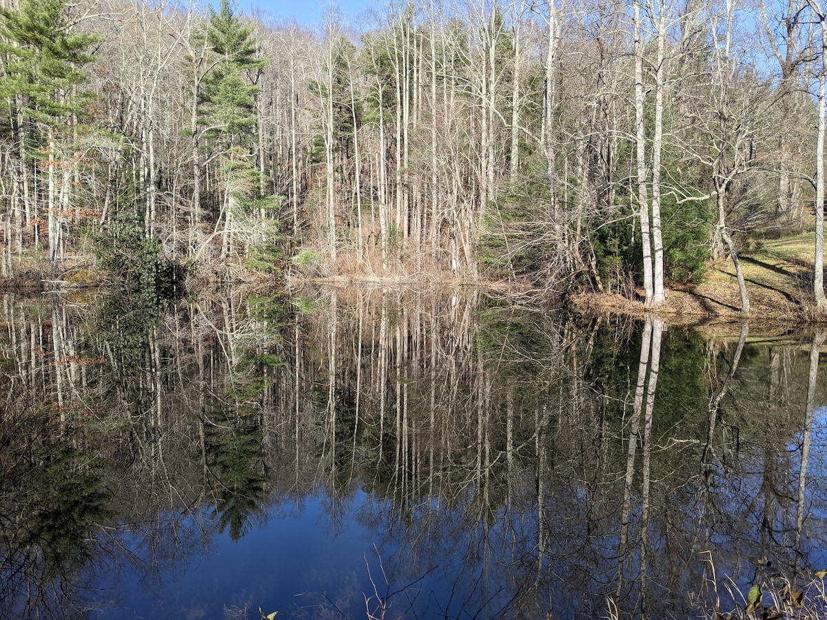Olen pieni mökki, joka sijaitsee upeassa ympäristössä muiden talojen kanssa sorateillä. Omistajani laittavat sydämensä ja sielunsa luomukseeni. Minulla on 2 makuuhuonetta, iso huone, keittiö, pesukone, 2 kuistia, patio ja nuotiopaikka. Sijaitsee 2,5 mailin päässä Saludasta, Pohjois-Carolinasta, joka on ihastuttava pieni WNC-kaupunki. Olen kukkulalla pienen yksityisen järven yläpuolella *kesästä 2025 alkaen – järvi on tilapäisesti tyhjennetty pitkäaikaisten korjausten vuoksi* EI WIFIÄ, heikko kännykkä. Vieraslippu järvikohteeseen. EI LEMMIKKIELÄIMIÄ tai TUPAKOINTIA - tiukka käytäntö.