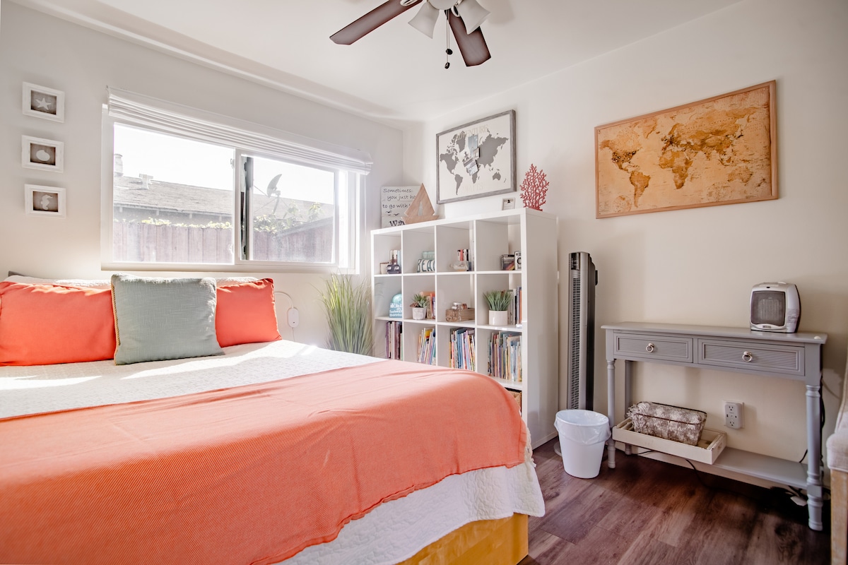 Sunny Days is a beautiful and spacious 600 sq. ft. studio apartment with a private entrance and patio. You'll love the bright and airy space, complete with 10-foot ceilings! In the evenings, relax with a glass of wine in the cozy private patio, grilling dinner on the BBQ, and hanging around the gas fire pit. We are centrally located to Newport Beach, John Wayne Airport, and Disneyland. Only a short walk to TeWinkle Park and the OC Fairgrounds. Easy free street parking in a lovely neighborhood.
