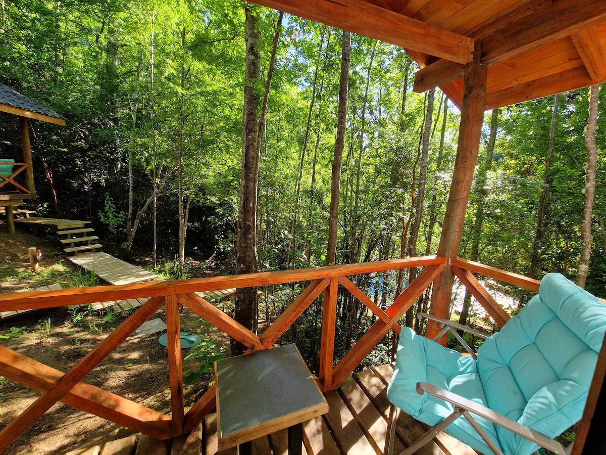 Minitalomajoitukset, joiden ulkopuolella on istuskelualue