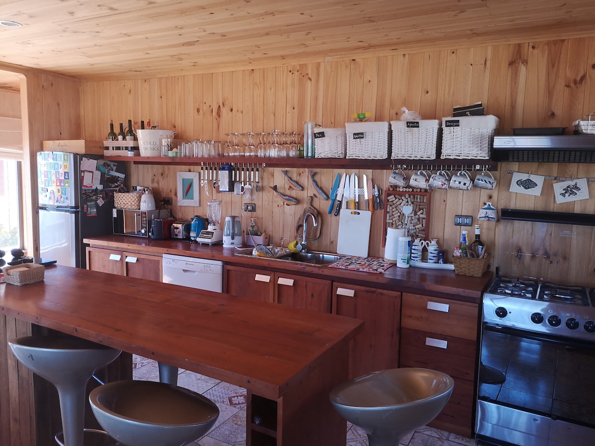 Punta del Gallossa, Tunquénissa, Quintayn ja Algarrobon välissä, kestävä tila rentoutumiseen ja yhteyteen luontoon. Maatiet, puiset aidat, 2 pientä rantaa 2 minuutin ajomatkan päässä, rotkot, lähteet. Puutalo, 72 m2, kaksikerroksinen, erinomaiset näkymät ja paljon valoa. Yksi king-huone merinäköalalla ja toinen, jossa on 3 yhden hengen vuodetta (kerrossängyt), molemmissa on lämmittimet. Keittiö, olohuone ja ruokailuhuone yhdistyvät terassille, grilliritilä, rantatuolit ja kokoontaitettava pöytä penkeillä. Bosca-puuhellat.