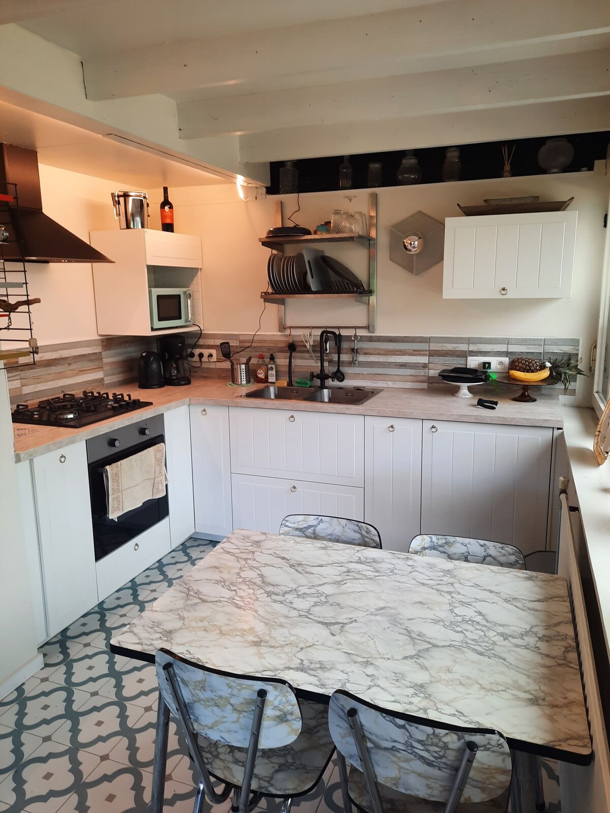 Lomamökki, jossa on kaunis aurinkoterassi, jolta on näkymä Maasille, ilmainen pysäköinti 2 autolle lomamökissä ja katettu polkupyörävarasto poissa näkyvistä. Koira on sallittu, mutta emme pidä koirien hajusta lomamökissä. Löydät viehättävät Meuse-kylät ja maistat todellista Limburgin ystävällisyyttä lähellä Hoge Kempenin kansallispuistoa, Maasvallei-joen puistoa ja Aldeneyckin viinialuetta. Se on ihanteellinen tukikohta pyöräilyyn veden läpi, Maastrichtissa vierailemiseen tai Elaisa Wellnessin hemmotteluun.