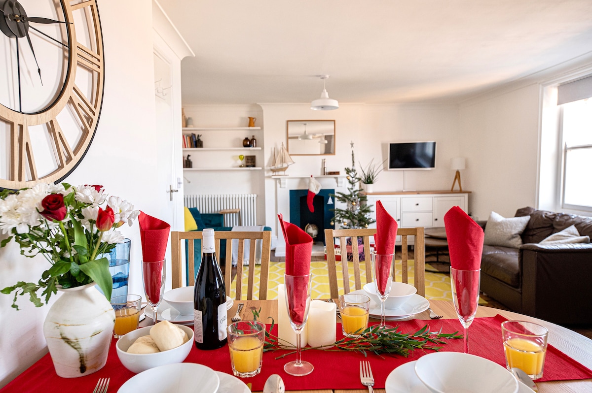*Joulukoristeet* The Lookout on valoisa ja tyylikäs rantahuvila, joka sijaitsee historiallisessa talossa tämän viehättävän kaupungin keskusaukiolla: * Ilmainen myöhäinen uloskirjautuminen klo 11.00 + ei siivous- tai palvelumaksuja* - 3 ylellistä makuuhuonetta (1 x Superking, 2 x parivuode), erittäin mukavat patjat ja laadukkaat vuodevaatteet - 2 kylpyhuonetta, yksi roll-top, yksi sähkösuihku - Täysin varustettu keittiö, astianpesukone ja pesukone/kuivausrumpu - Upeat suorat merinäkymät - Nopea WiFi - Vauvat, lapset ja koirat ovat tervetulleita - Ilmainen, helppo pysäköinti lähistöllä