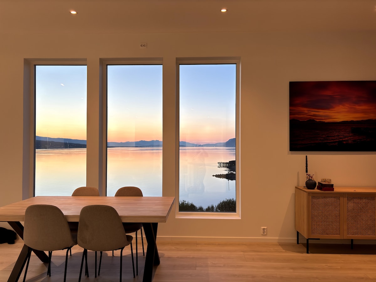 Upea uusi talo (2018) kauniilla, hiljaisella alueella, josta on kaunis näköala vuonolle/merelle, vuorille ja metsään Kvaløyassa /Tromssassa. Voit katsella kauniita revontulia/revontulia valtavasta ikkunasta (10 m ²), istuen olohuoneessa kuppi teetä tai kahvia kädessäsi: -) Tämä on täydellinen paikka turisteille, jotka haluavat nähdä revontulen, valaat vuonossa talvella, vaellus/ hiihto vuorilla tai kaikki muu mitä haluat tässä ihanassa kaupungissa.