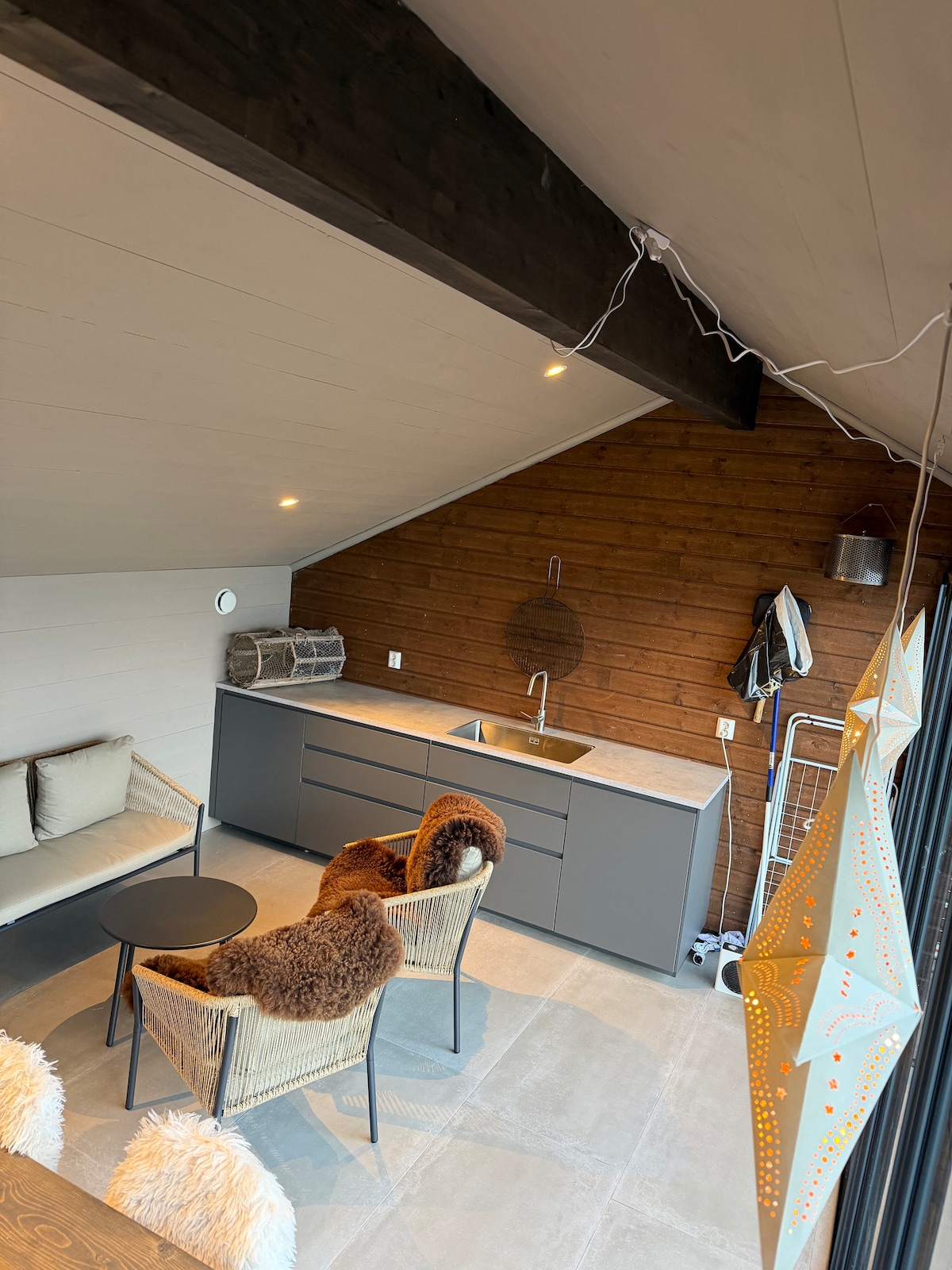 Ihana huoneisto meren rannalla, johon on liitetty ulkoilmalounge