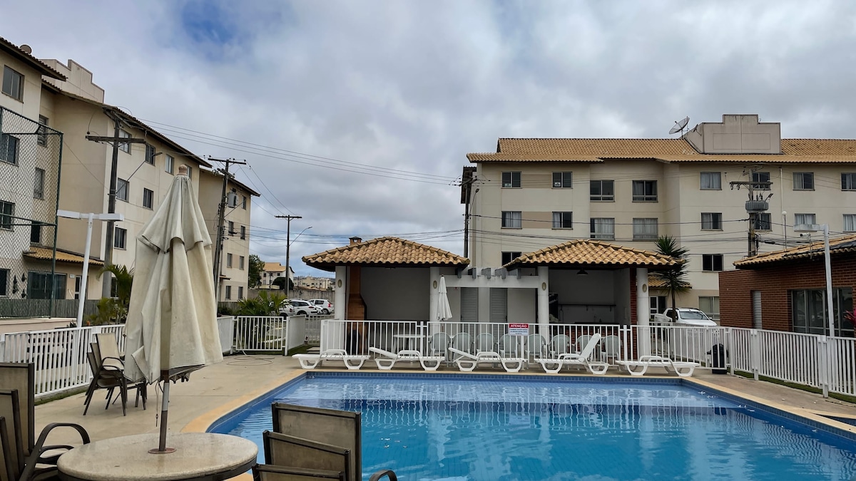 Apartamento bem localizado próximo a supermercado, padaria e farmácia .Dispõe de piscina,academia,parquinho para uso dos hóspedes. Quarto 1: 2 camas de solteiro,podendo unir para um casal, ventilador Quarto2- Suíte : 01 cama de casal e um banheiro Banheiro social, ferro de passar, ventilador Cozinha : com air fryer, microondas, liquidificador,itens básicos de panelas, talheres Sala: Tv SMart, sofá cama, Wi-Fi Quintal: mesa, bancos e churrasqueira.