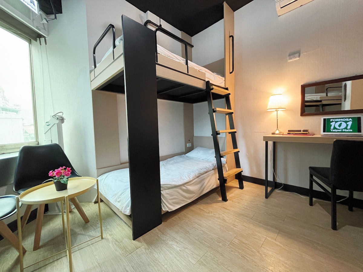 Mahtava yksityinen huone, jossa on 2 yhden hengen vuodetta ja jaettu kylpyhuone, ei ikkunaa: WIFI, ilmastointi. Pääsy kaikkiin julkisiin mukavuuksiin: olohuoneeseen, keittiöön, pesukoneisiin ja kuivausrumpuihin. Japanilainen tatami chill-out-tila. Vastaanotto on avoinna päivittäin klo 9-21. Itsepalvelusisäänkirjautuminen saatavilla päivittäin klo 21.00 jälkeen. Lähellä Taipein päärautatieasemaa (MRT, HSR, TRA) voit kokea paljon erilaisia Taiwanin nähtävyyksiä samalla kun pysyt muutaman minuutin päässä Ximendingin alueelta. Taipein päästa., Ximen M.T, Taoyuanin lentokenttä, Ximending - alle 10 minuuttia.
