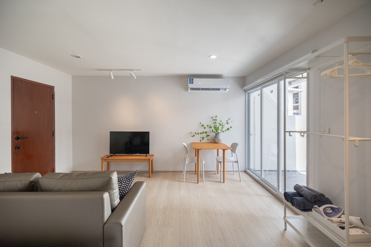Tilava koko asunto, jossa on oma kylpyhuone, keittokomero, olo-/ruokailutila, 1 makuuhuone, jossa on työskentelyalue, ja parveke. Nauti leveistä ikkunoista, joista on esteetön näkymä ja paljon auringonvaloa, mikä lisää ilmavuutta ja tekee majoittumisesta rentouttavampaa. Nauti kaikista kaupunkielämän mukavuuksista, kuten: - 5 minuuttia BTS Asok, MRT Sukhumvit – 5 minuuttia Terminal 21:een, Emporiumiin/Emquartieriin ja Benjasirin puistoon - 1 minuutti 7-11 -kauppaan - Paljon katuruokaa, kahvila ja taksi/pyörät