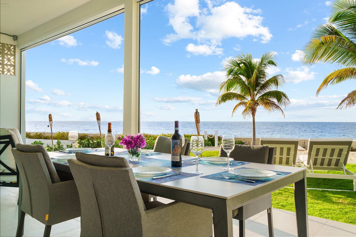 Relax with family & friends in this 2200 sqft, 3-bedroom condo. The best panoramic oceanfront views on island. Majestic sunsets and sunrise over the Caribbean Sea visible from large kitchen, dining, living, master bedroom and shower! Hammock, rocking chairs, dining table on oceanfront balcony. Unparalleled proximity to ocean lets you fall asleep to sounds of waves. Direct shore dive access & best snorkeling. Pool, tennis, covered parking. Walk to dive shop, restaurant, and white-sand beach.