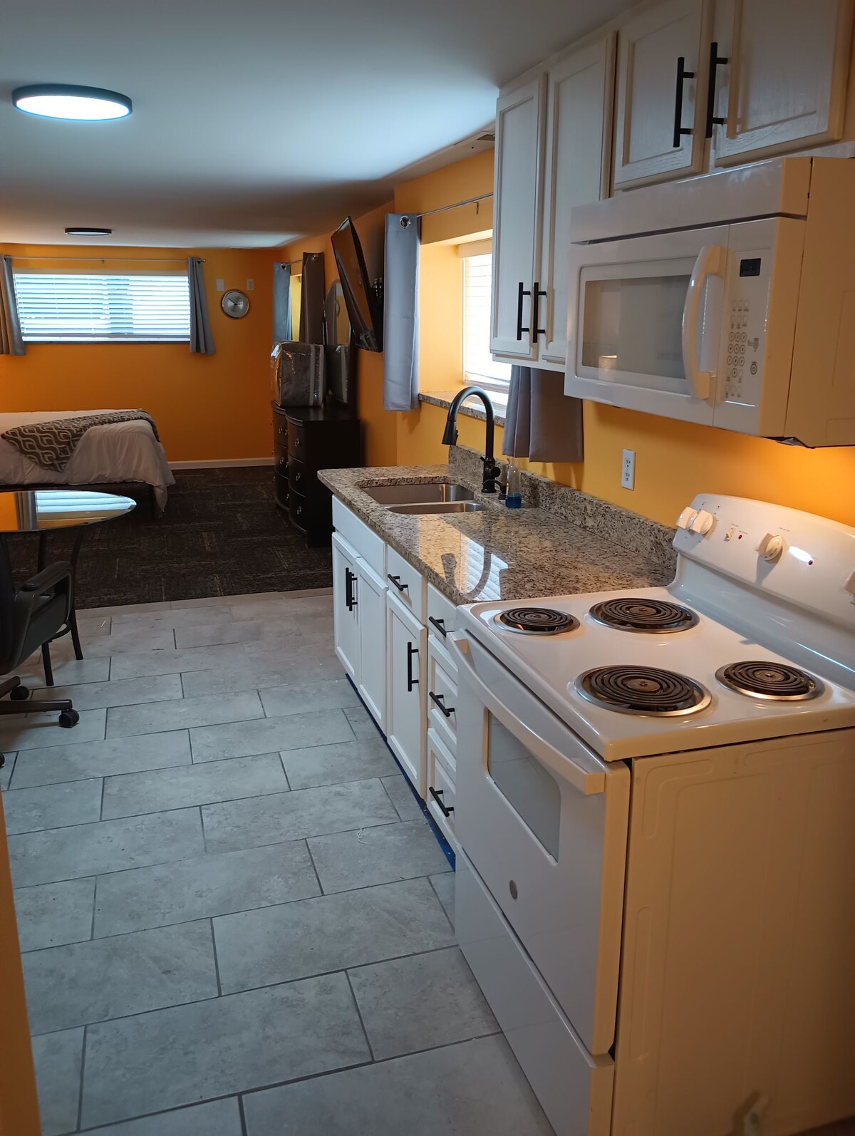 Odotamme innolla, että saan toivottaa sinut tervetulleeksi yksityiseen sviittiin, joka on kodissamme sijaitseva vierastila. Sinulla on yksityinen sisäänkäynti ja 3 huonetta käytössäsi. Siellä on olohuone, jossa on pöytä ja tuolit, makuuhuone, jossa on queen-size-vuode, yöpöydät, lipasto ja vaatehuone, jossa on ripustimet, sekä äskettäin remontoitu kylpyhuone. Käytävässä on myös keittokomero, joka on antiikkinen Hoosier-kaappi, jossa on mikroaaltouuni, minijääkaappi, kahvipannu ja vedenkeitin.
