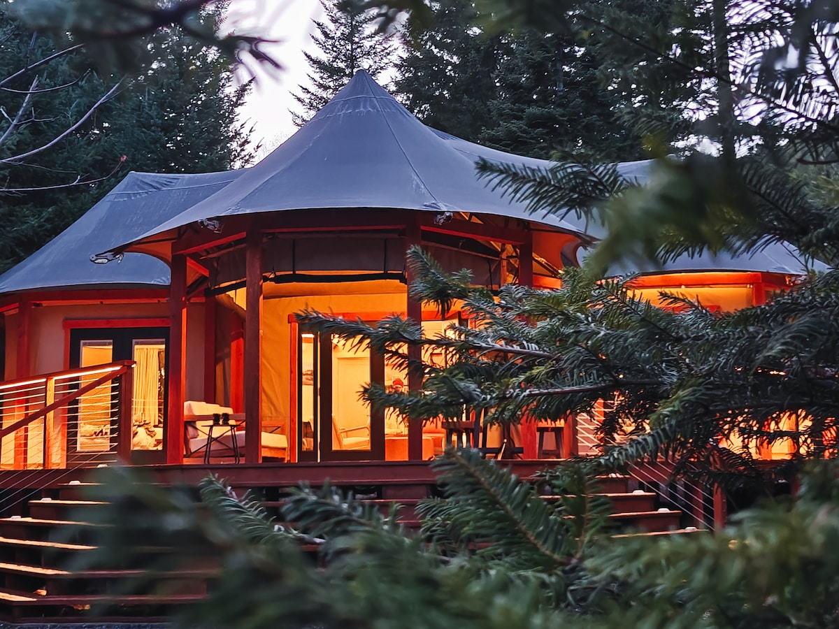 Tämä ylellinen safarin inspiroima telttapaikka tuo glamouria glampingiin! Kestävän kehityksen mukaisen telttamme ansiosta tämä glamping-elämys "wow" ystäväsi ja perheesi. Telttamme sijaitsee kätevästi vain 30 minuutin päässä Portlandista. Rentoudu porealtaassa ja ui uima-altaassa. Meillä on aamiaistila, jossa on mikroaaltouuni ja kahvia/välipaloja. Tarjoamme myös maatila-aamiaista (20 dollaria/henkilö). Täydellinen paikka paeta arjesta. Sinä ja perheesi voitte viettää aikaa yhdessä nuotiopaikalla ja kävellä koirien kanssa erämaassa kiinteistön takana.
