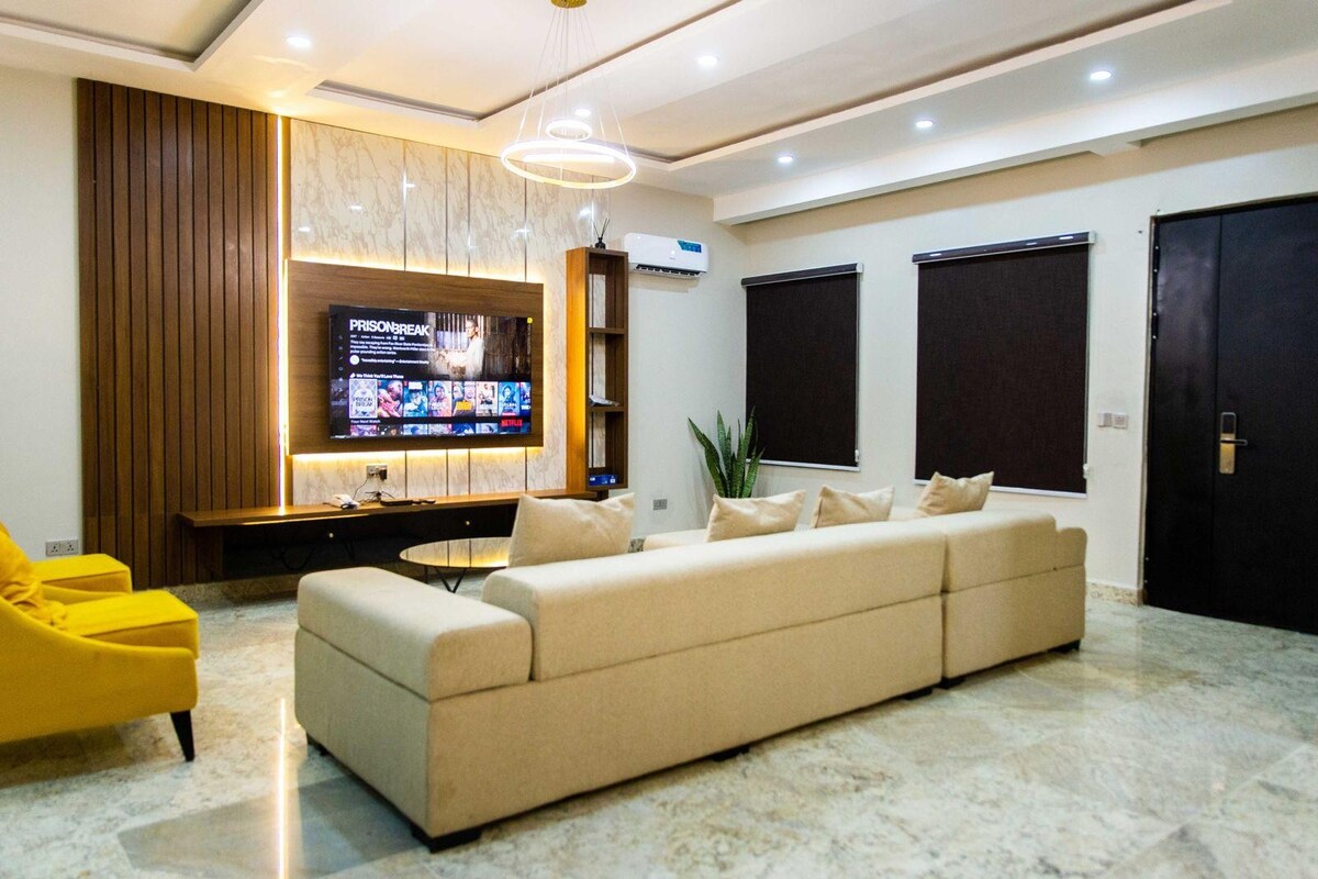 Enjoy a stylish experience at this centrally-located Apartment. A 2 bedroom apartment with features like PlayStation 5 & Latest Games on request, Godfather Clock Antique clock, 65 inches Tv. we also offer tight security, 24/7 surveillance, 24/7 Power with backup Generator, WI-FI, Free parking, providing residents with a sense of safety and peace of mind. We have the best shopping centre’s & clubs nearby like 4U Supermarket, H-Medix, Pay Greens supermarket etc.