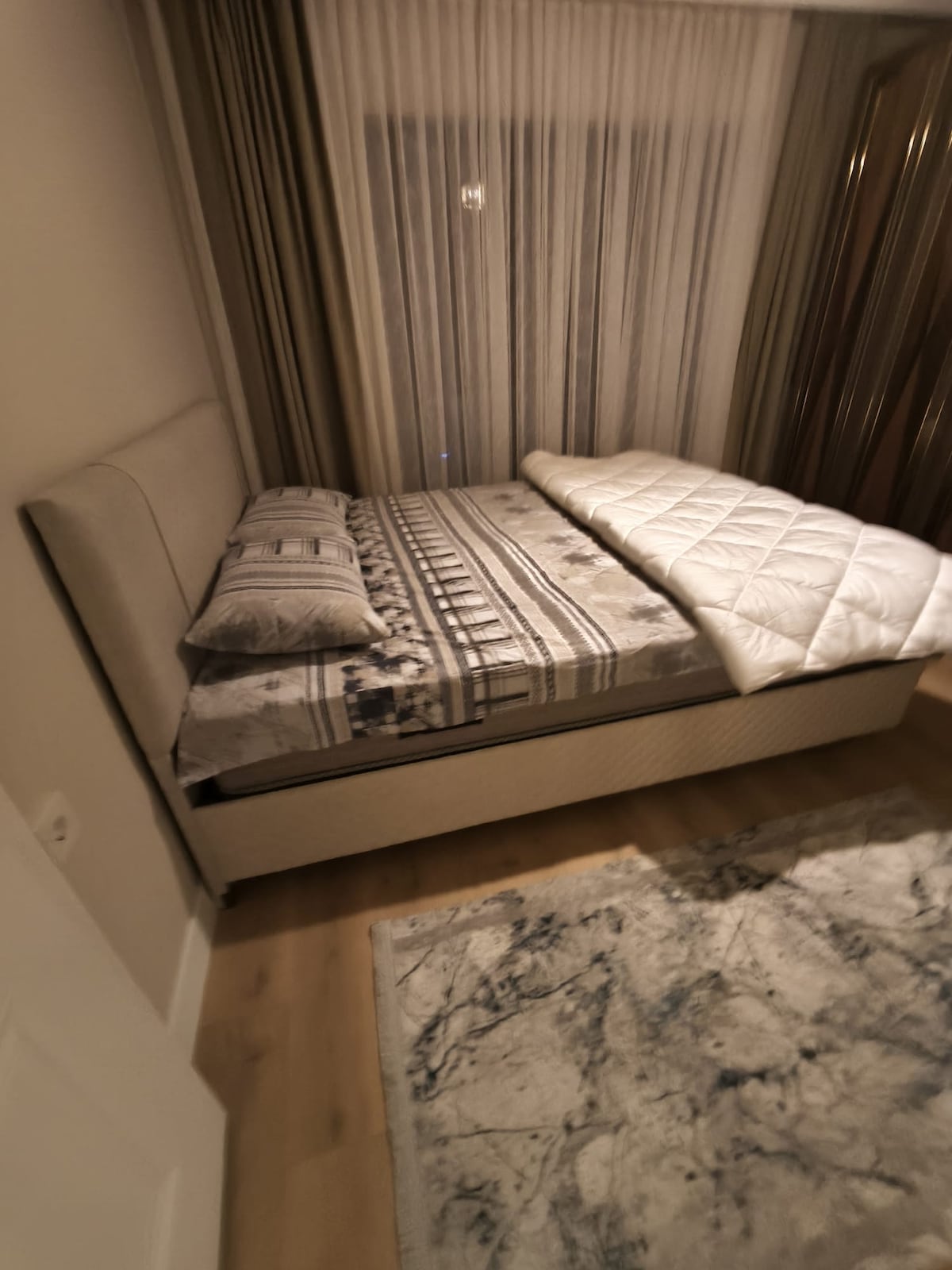 Experience luxury living in this sun-drenched 1+1 apartment in Batikent. Enjoy panoramic city views through stunning floor-to-ceiling windows. This modern suite features: Living: Stylish design with dining area & Smart TV. Kitchen: Fully equipped with high-end Siemens appliances. Bedroom: Plush double bed, vanity, and balcony access. Located in a prime area, this home offers fast Wi-Fi and premium finishes. Perfect for couples or business travelers.