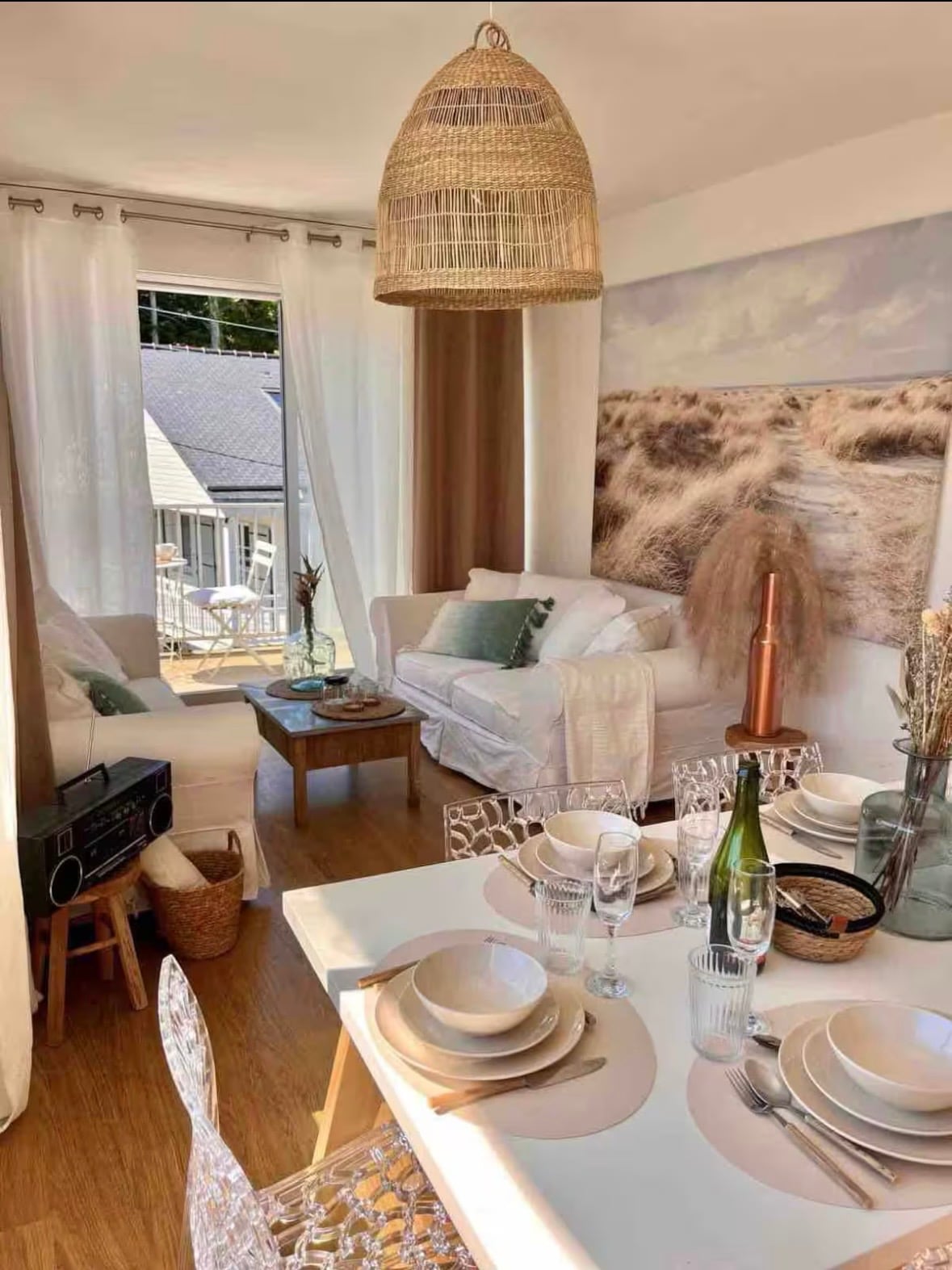NAUTI UPEASTA PANORAAMASTA - Binicin pienessä venesatamassa sijaitseva 40 m2:n rantakoti sopii 4 hengelle. Sen erinomaisen sijainnin ansiosta voit nauttia täysin ranta- ja majakanäkymästä. Olohuone tarjoaa ihanteellisen ympäristön rentoutumiseen auringonoton ja tutustumisen jälkeen. Istu sohvalle ja nauti näkymästä ja sinisen ja smaragdinvihreän sävyistä, jotka muuttuvat hetki hetkeltä vuoroveden mukaan. Paikka, jossa voit ankkuroitua ⚓️