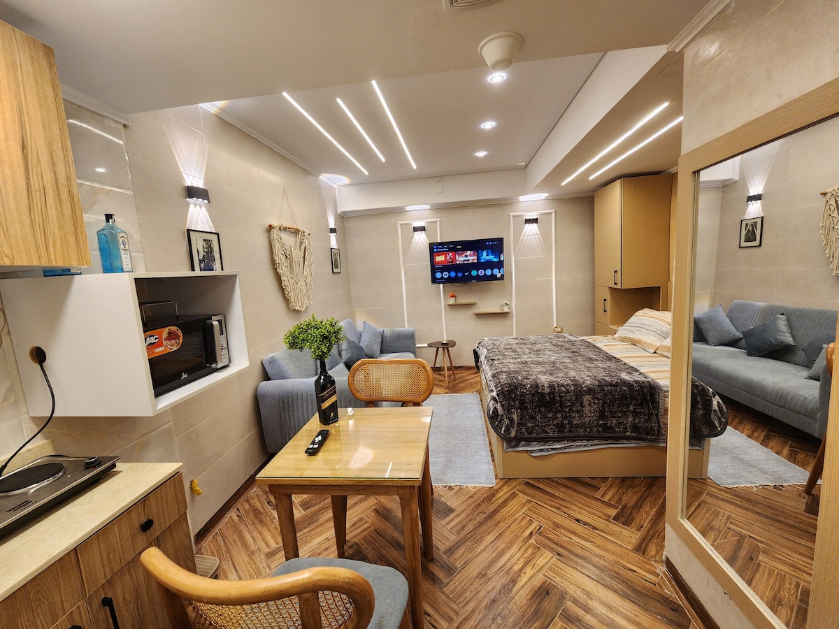Rentoudu lämpimässä ja tyylikkäässä Al Khayam -studioossamme, joka sopii täydellisesti pariskunnille, yksin matkustaville tai pitkäaikaisiin majoituksiin. Tässä rauhallisessa lomakohteessa on pehmeä valaistus, mukavat istuimet, täysin varusteltu keittiö ja tyylikkäitä yksityiskohtia kaikkialla. Se on vain muutaman askeleen päässä Kairon parhaista kahviloista ja kulttuurista.