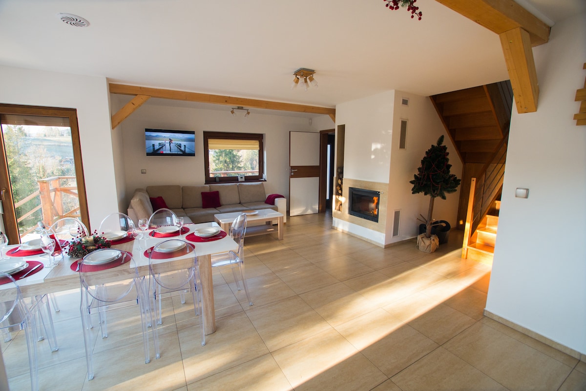 Löydä rauha Closer to Heavenista, ylellisestä lomakohteesta Koskowa-vuorelta, joka sijaitsee 820 metriä merenpinnan yläpuolella. Nauti panoraamanäkymistä Beskid Wyspowylle ja Tatra-vuorille tilavalta terassilta. Tätä 88 neliömetrin ympäristöystävällistä kohdetta ympäröi 2 300 neliömetriä yksityistä maata. Rentoudu ympäri vuoden avoinna olevassa 5 hengen kloorittomassa ulkoilmakylpylässä, jossa on 2 hierontatuolia. Puhdas lähdevesi, jääpalakone jääkaapissa ja nopea wifiyhteys lisäävät mukavuutta. Polut, metsät ja luonto odottavat – lähempänä taivasta, lähempänä sinua.