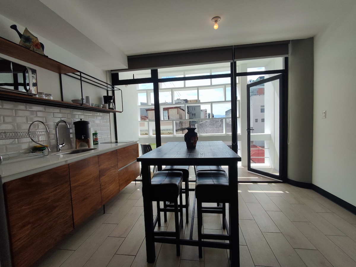 Tämä viihtyisä loft tarjoaa sinulle mukavuutta ja ihanteellisen sijainnin lomallesi. Siinä on kaikki palvelut ja parveke, jolta on kauniit näkymät. Vain muutaman askeleen päässä on erilaisia ravintoloita (jopa samassa rakennuksessa!), kahviloita, baareja, historiallisia rakennuksia ja monumentteja sekä käsityömarkkinoita. Hyvän sijainnin ansiosta pääset helposti kaikille kaupungin alueille ja 15 minuutissa voit saapua La Auroran kansainväliseltä lentokentältä Uberilla tai taksilla.